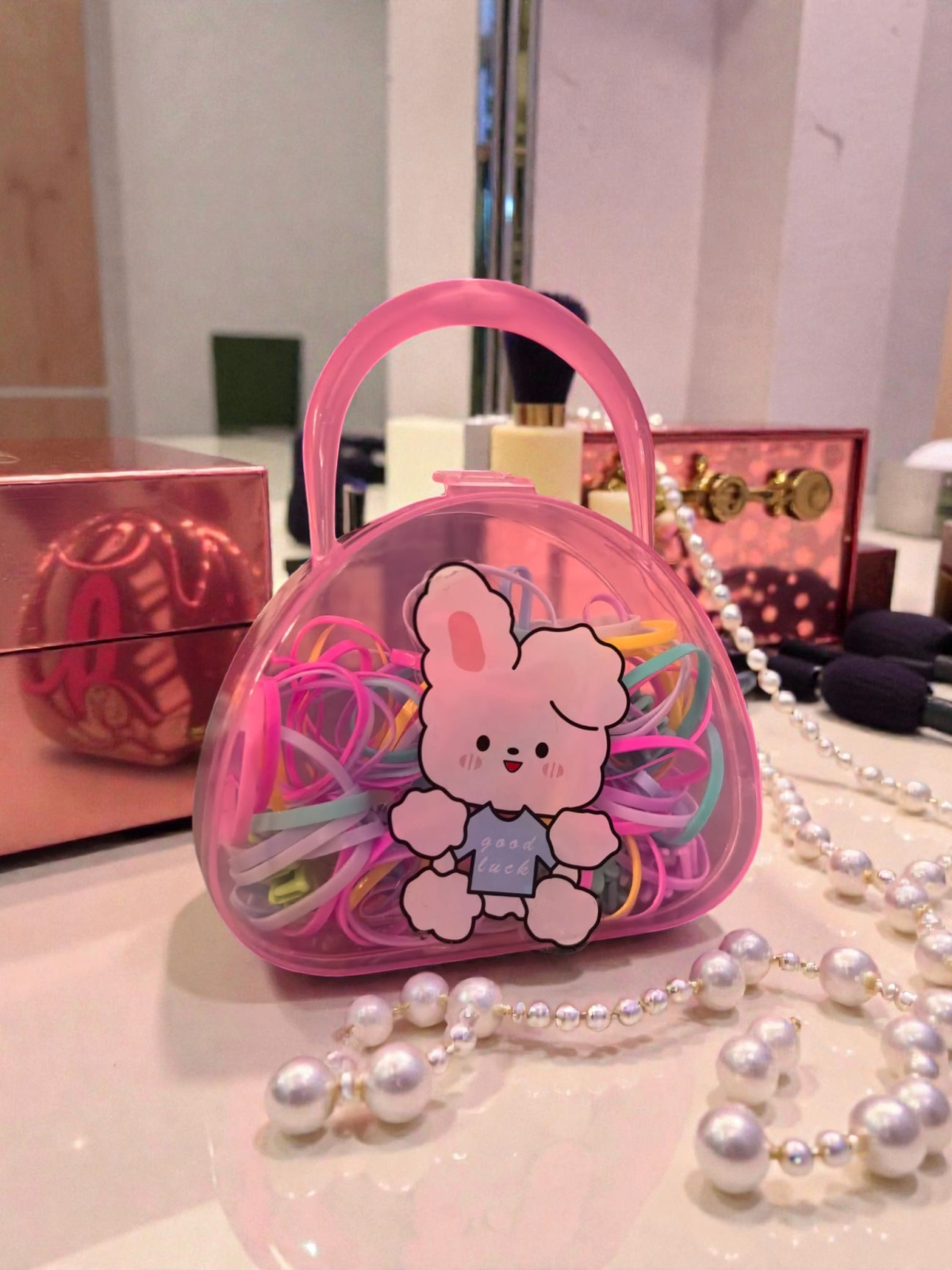 Set Accesorii Păr „Borseta Veselă” – Cutie cu Personaje, Mâner și Zeci de Elastice Colorate
