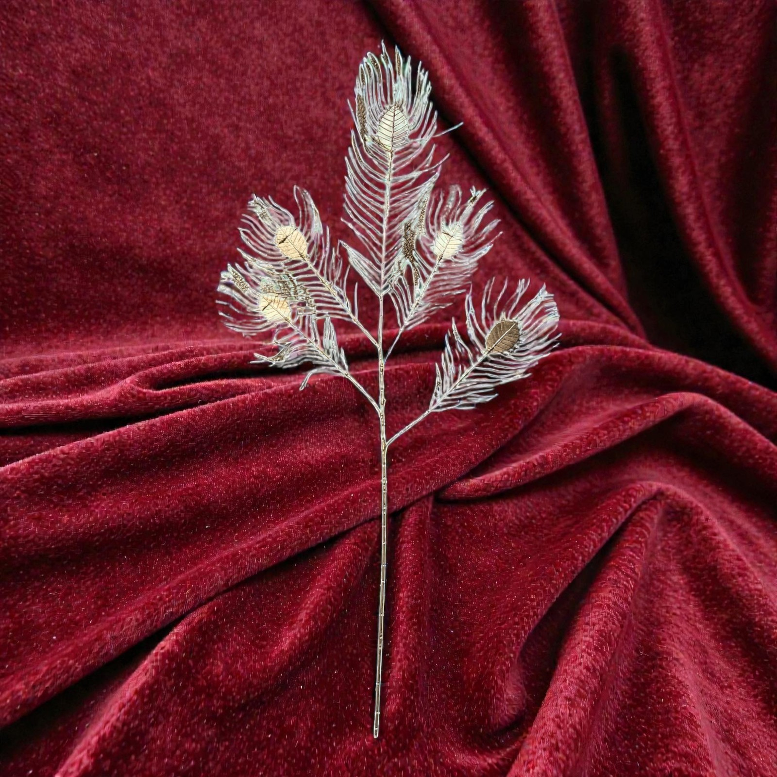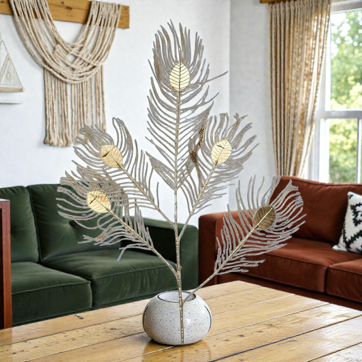 Transformă atmosfera oricărei încăperi cu ajutorul acestei ramuri decorative spectaculoase. Cu o înălțime de 90 cm și un design artistic inspirat de formele organice ale penelor de păun, această piesă devine instantaneu punctul focal al decorului tău.