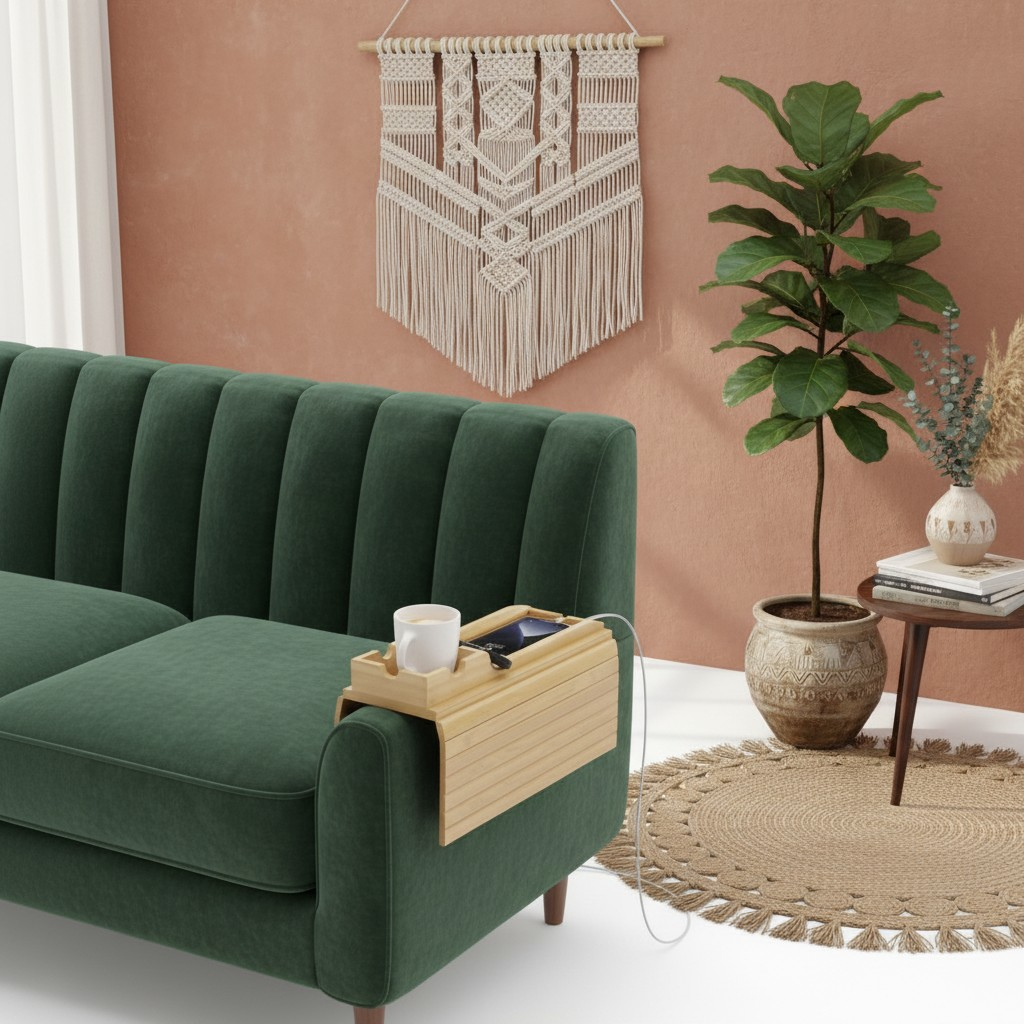 Dincolo de rolul de organizator, acest suport funcționează ca o barieră de protecție pentru tapițeria canapelei tale, prevenind petele de cafea sau urmele lăsate de paharele umede. Slotul special pentru telefon îți permite să urmărești notificările sau să vizionezi clipuri video fără să obosești mâna, în timp ce compartimentul pentru pahar oferă siguranța de care ai nevoie pentru a nu vărsa băutura pe materialul textil. Designul său modular se pliază ușor după utilizare, ocupând un spațiu minim în depozitare, deși estetica sa îl face să merite un loc permanent „la vedere”.