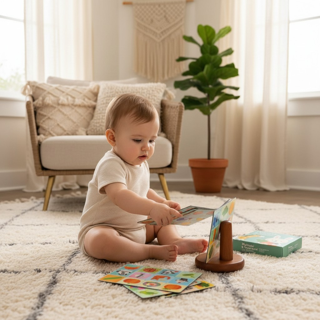 Material de Calitate: Carton dens, rezistent, cu finisaj mat pentru a elimina reflexiile ce pot obosi ochii sensibili ai bebelușului.
