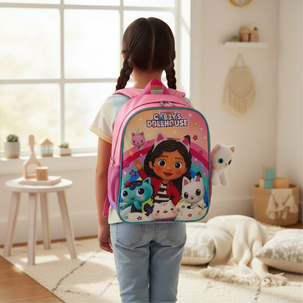 Pregătește-ți micuța pentru noi aventuri pline de creativitate cu acest ghiozdan model Gabby's Dollhouse. Conceput special pentru fanii universului creativ al lui Gabby, rucsacul o prezintă pe îndrăgita protagonistă alături de prietenii ei feline într-un decor plin de culoare și voie bună.