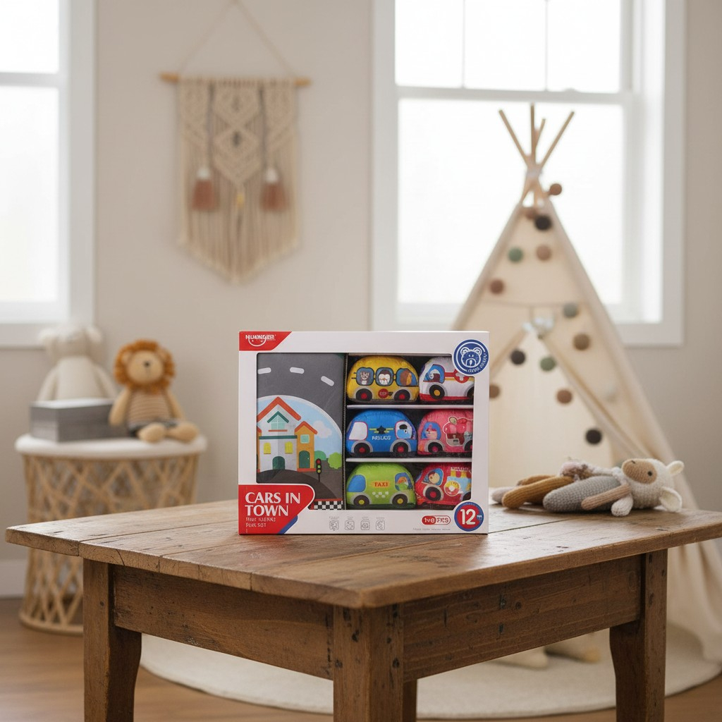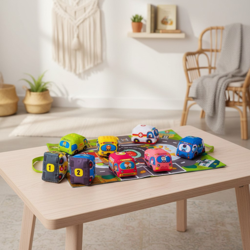 Siguranță Maximă: Mașinuțe realizate din material textil moale, cu colțuri rotunjite, ideale pentru dentiție și mânuțe delicate.