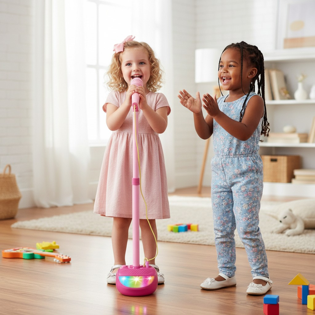 Echipat cu efecte luminoase LED care pulsează în culori vii, microfonul creează o atmosferă de festival chiar în camera de joacă. Butoanele integrate permit accesul rapid la melodii predefinite, ajutându-i pe cei mici să își exerseze ritmul și să își dezvolte urechea muzicală. Este jucăria ideală pentru copiii care adoră să cânte, să recite poezii sau pur și simplu să fie în centrul atenției.