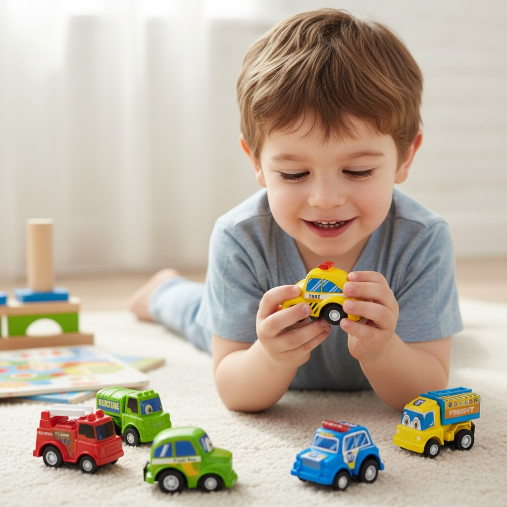 • Design "Cartoon" vesel și colorat: vehicule cu fețe prietenoase care captează imediat atenția micuților.