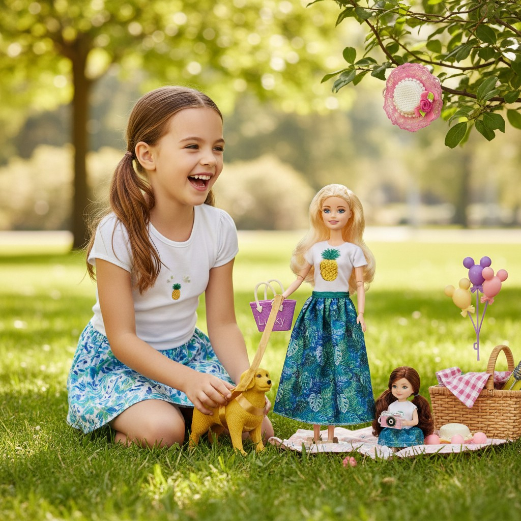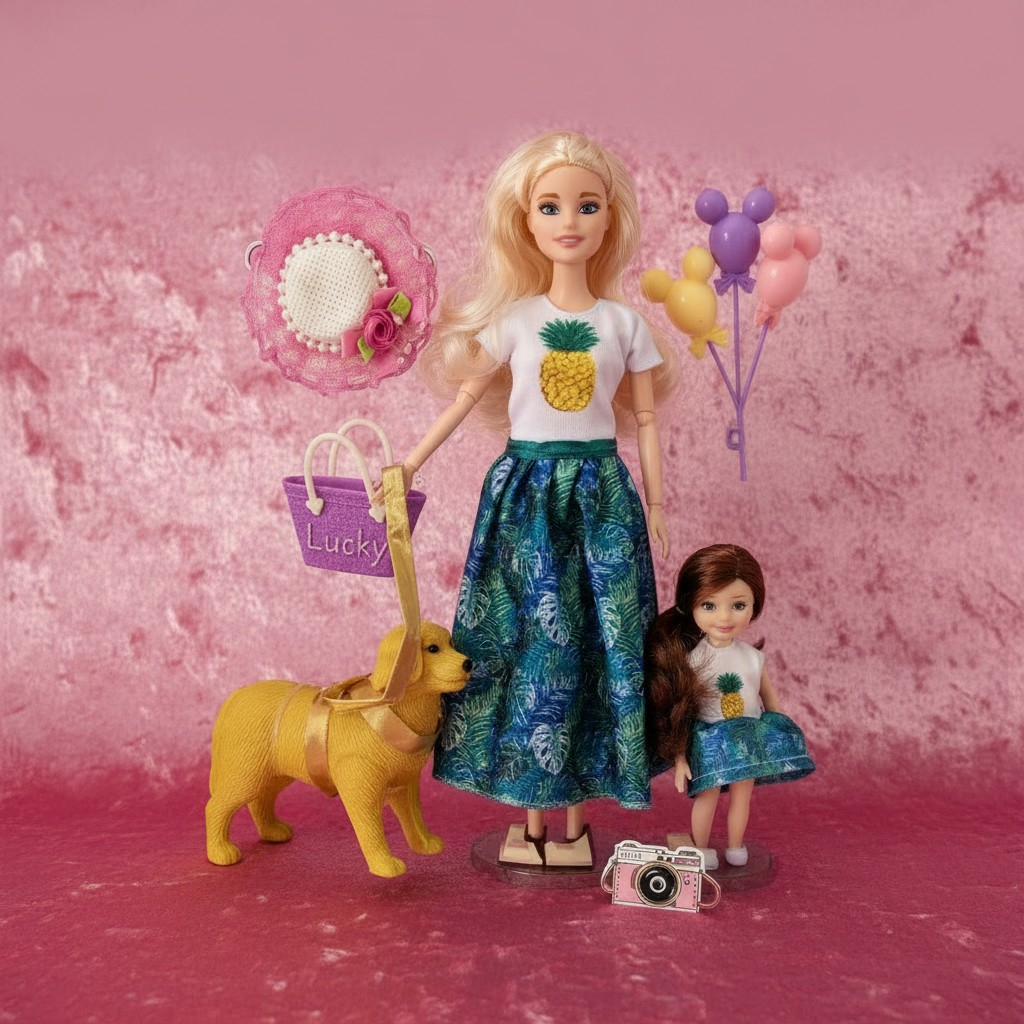 Fiecare element al setului este gândit pentru a oferi o experiență de joacă cât mai realistă. Păpușa adultă impresionează prin părul blond lung, gata de coafat, în timp ce fetița o însoțește pretutindeni în ținute asortate. Cățelușul auriu cu bandana sa norocoasă și poșeta mov adaugă un plus de farmec fiecărei povești inventate, transformând joaca într-o experiență interactivă completă.