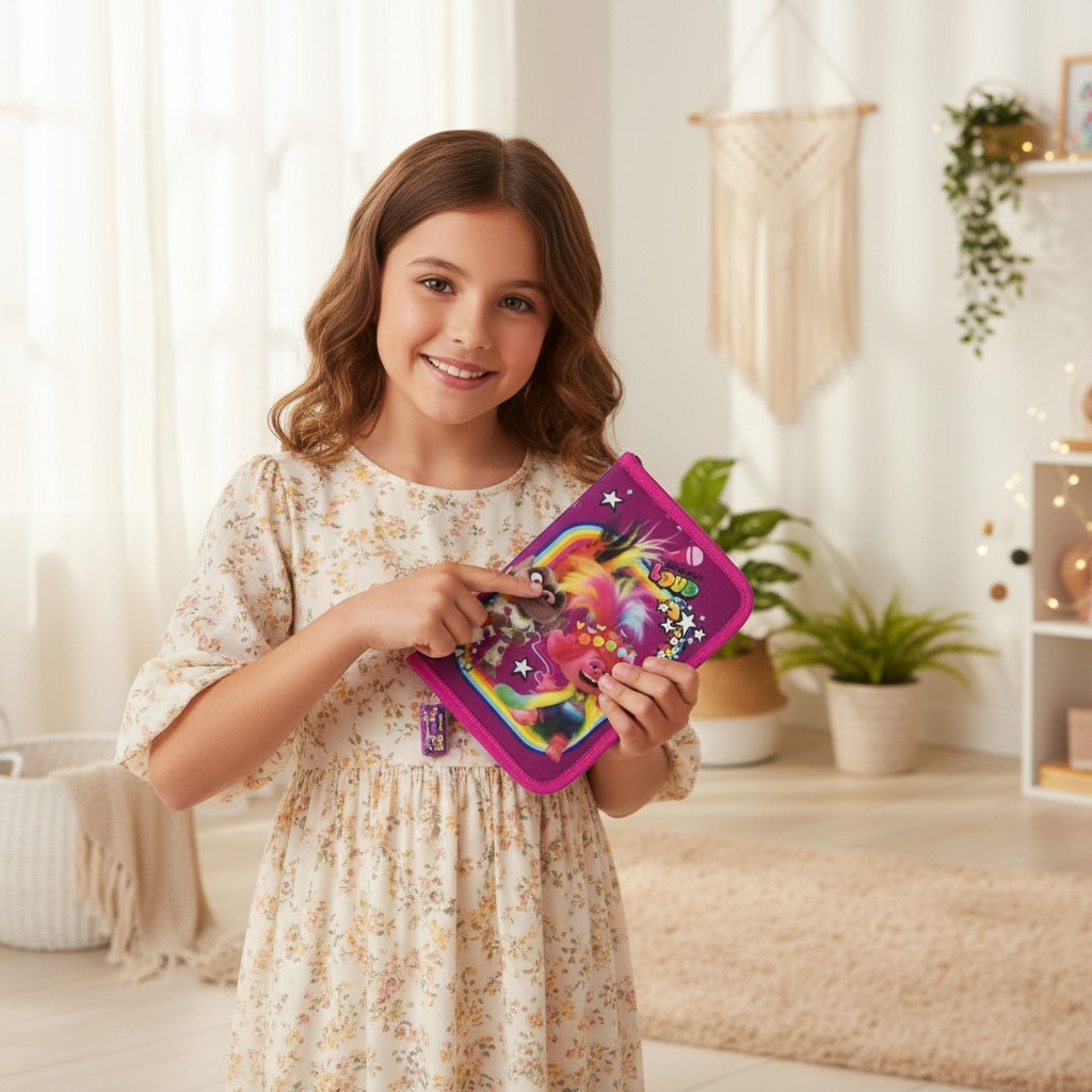 Fiecare zi de curs este o oportunitate de a străluci alături de personajele tale preferate din regatul Trolls! Acest penar licențiat este conceput să aducă un zâmbet pe buze chiar și în timpul celor mai grele teme. Structura sa cu două flapsuri interioare funcționează ca o scenă perfect organizată: acestea se deschid pentru a dezvălui elasticele de fixare, permițându-i micului elev să își sorteze rechizitele pe culori sau să își găsească „pixul norocos” dintr-o singură mișcare rapidă.