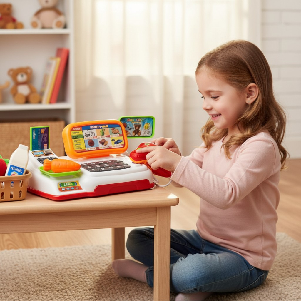Jocul de rol este esențial în dezvoltarea abilităților sociale și de comunicare. Utilizând casa de marcat, copiii exersează număratul, învață să interacționeze cu "clienții" și își dezvoltă coordonarea mână-ochi folosind scannerul manual și slotul pentru cardul de credit.